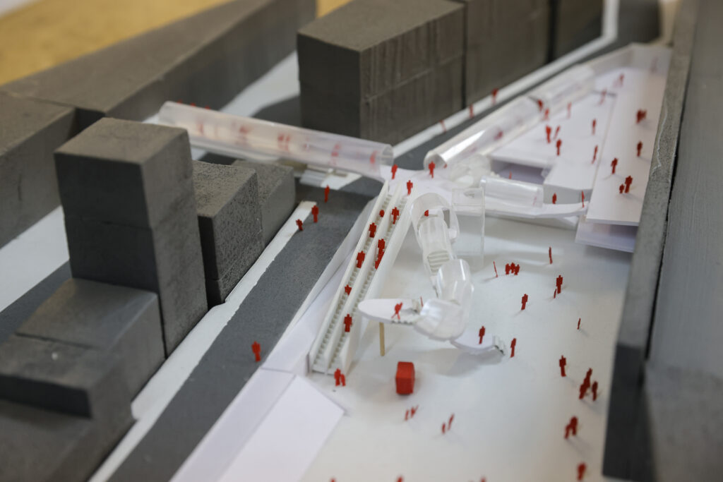 京橋駅周辺の再開発にともないその駐輪場が撤去されるため、これを移設するために隣接する京阪モールの一部を除去し、さらに駅と駅とをつなぐ道を創出し、新たな京橋の発展の場となるよう設計しました。ビジネス街であり、飲み屋街でもあり、出勤等の乗り換えの中継地点である京橋駅の特性を生かすために、利用者が寄り道をし、少しでもこの場所で時間を使うようにするにはどのようにすればいいのか、とても苦労しました。