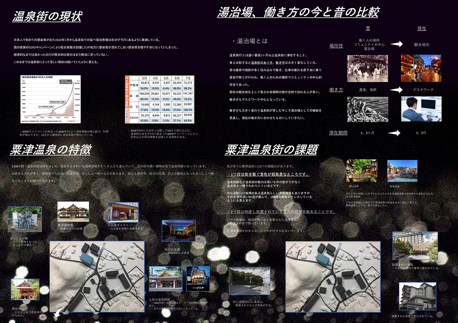 現在新型肺炎の影響により多くの人が被害にあっています。その中で大きな被害を受けたのは温泉街です。不要不急の外出を自粛する国の方針により温泉街に足を運ぶ人の数は激減しました。今回テーマにしたのは自分が高校時代に住んでいた小さな温泉街です。世界全体が大きな変化を求められる今こそ昔のあり方、温泉街の本来のあり方を見直つつ新しい温泉街のあり方を提示したいと思います。