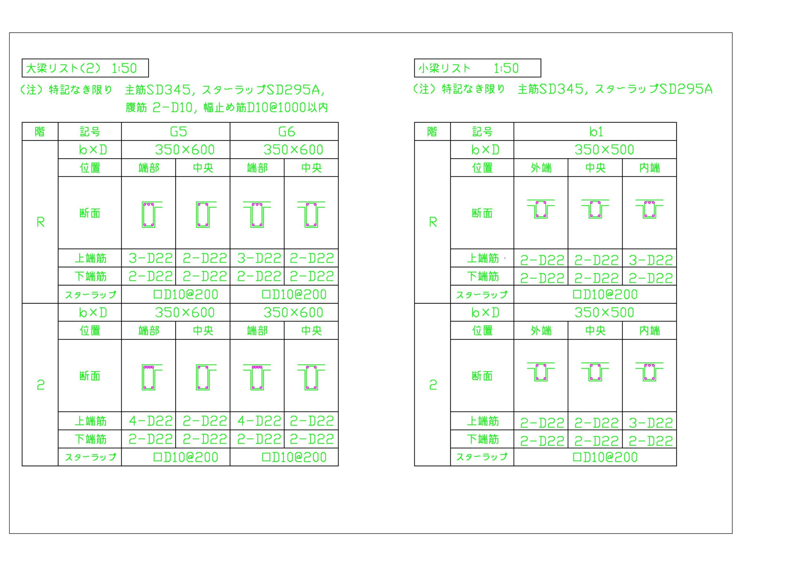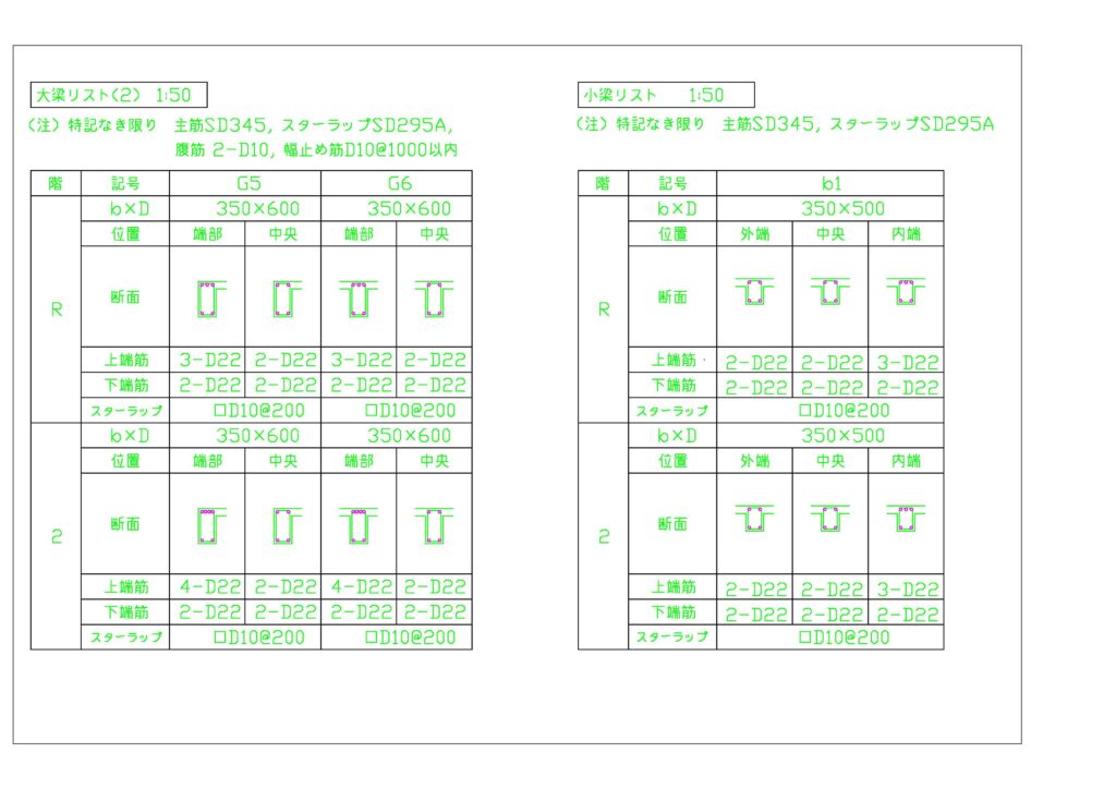 構造図は、伏図(平面図)、軸組図(断面図)、配筋詳細図、部材リスト(柱・梁のリスト)などで構成されている。