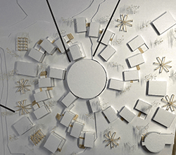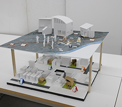 彼は卒業設計に限らず、何事に対しても一言言いたい!!という性格であり、内心心配しておりました。今回もやはりいきなり火が付いたように制作をおこないました。最初のコンセプトは忍者からからくりのある家等の思いを取込みながら進行していきました。途中で構造や納まりなどで理解できないことが出ると気持ちがズレ、UP DOWNの連続でギリギリ間に合った作品で模型では彼の思いが一番に表現出来た作品だと思います。<山本 順也>