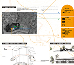 棚田に寄せる作者の熱い思いを提案する作品である。一部では「棚田百選」と持て囃されている美しい景色に相反して、消えゆく深刻な社会現象を見逃していない。建築的な表現手法は未熟であるが、何とか残せないものかと、見学者の迎え入れや、農作業の体験学習など、システムの構築を提案した考えを評価したい。こんなシステムが、全国的な「棚田の風景」を蘇らせる手立てになればと期待している。<青砥 聖逸>