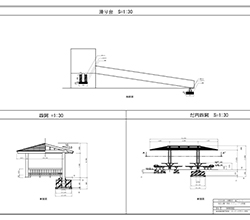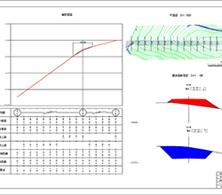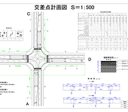 本作品は、私たちが日ごろ頻繁に使用している平面交差点の設計です。与えられた交通条件をもとに、交差点で渋滞が発生しないよう、信号の長さを調整するなどして計算した上で、交差点の幾何構造を決めました。一番苦労したポイントは、平面図の右折・左折導流路を描く部分です。内側半径・外側半径・緩和曲線の半径を算出し、それらを組み合わせて描いています。是非交差点の真ん中に着目してみてください。