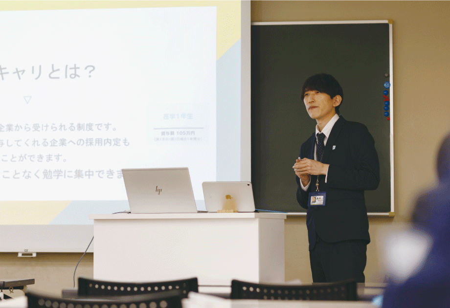 - 入学決定者と在学生が授業料の貸与を企業から受けられるプログラムです。さらにその企業から採用内定を得ることができ、早期の進路決定が実現できます。