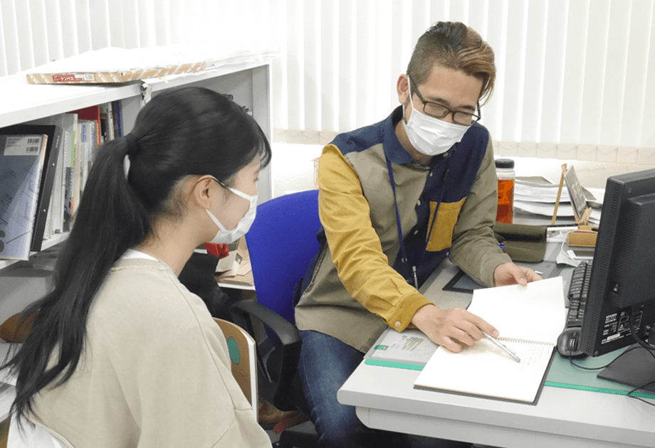 - 入学直後から始まる就職ガイダンスと併せ、就職活動が本格化する2年生に向けて、個別で面接指導、履歴書の書き方を指導します。