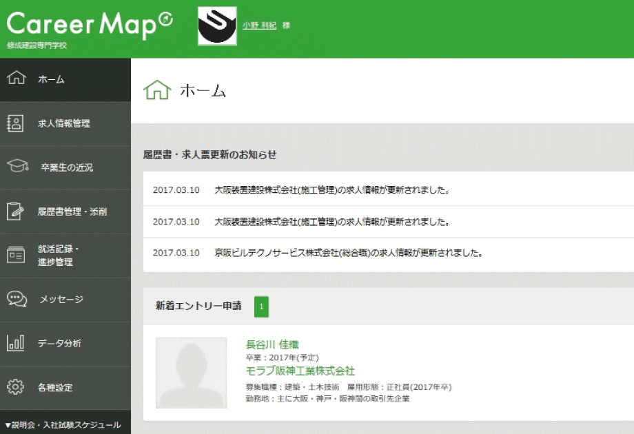 - 学校宛の求人票をWeb上で学生が閲覧できるシステム(キャリアマップ)を導入。学生は自分専用のページからいち早く求人情報をチェックできます。