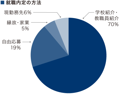 グラフが表す通り、約6割の学生たちが、「学校・教職員紹介」で理想とする企業と出会い就職しています。これは、修成の学生たちに対する、企業からのニーズが高いことを表しています。また、修成には、「家業を継ぐこと」を目的に学んでいる学生も多数見られますが、その多くは、一度、他の企業で経験を積むことを目的に、就職担当からの紹介を通じて就職しています。