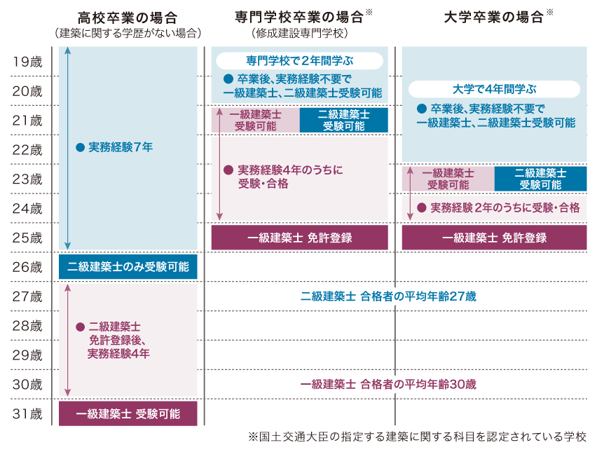 建築士法改正により、専門学校※または大学※での指定科目の修了で、一級建築士の受験も実務経験が不要になりました。ただし、免許の登録は、既定の実務経験年数が必要となります。