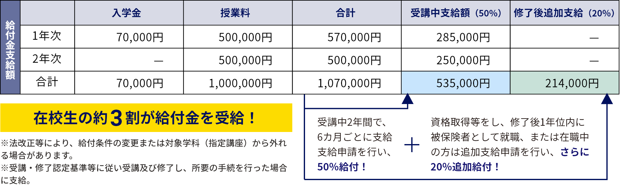 昼間部と比較すると約2分の1の学費に、さらに社会人学び直し支援制度と専門実践教育訓練給付金の併用も可能です。