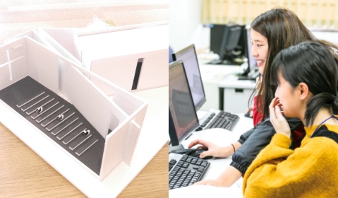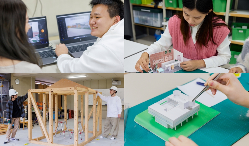 PCを使って設計したり、住宅模型を作成し完成作品を写真に残したりするほか、理想のカフェをデザインしたり、キットハウスを建てたり、建築の楽しさを感じることができます。