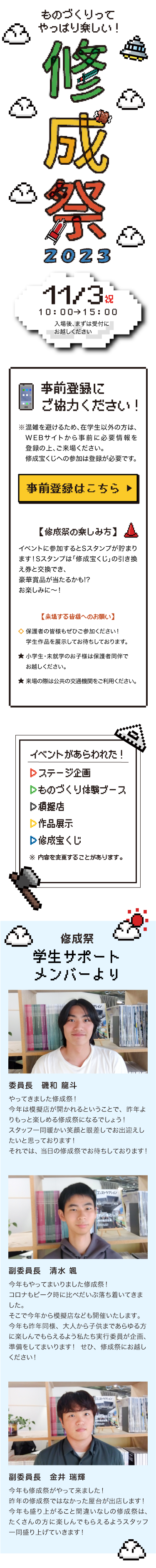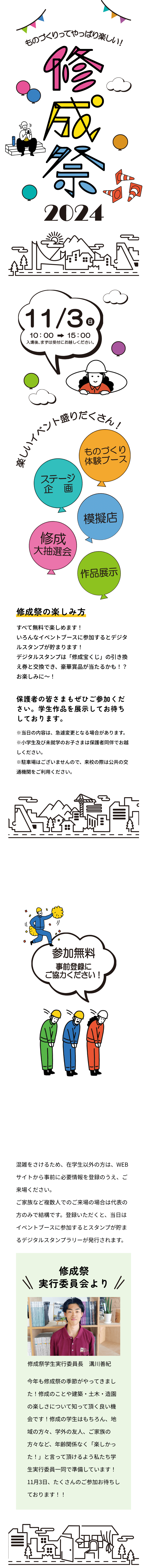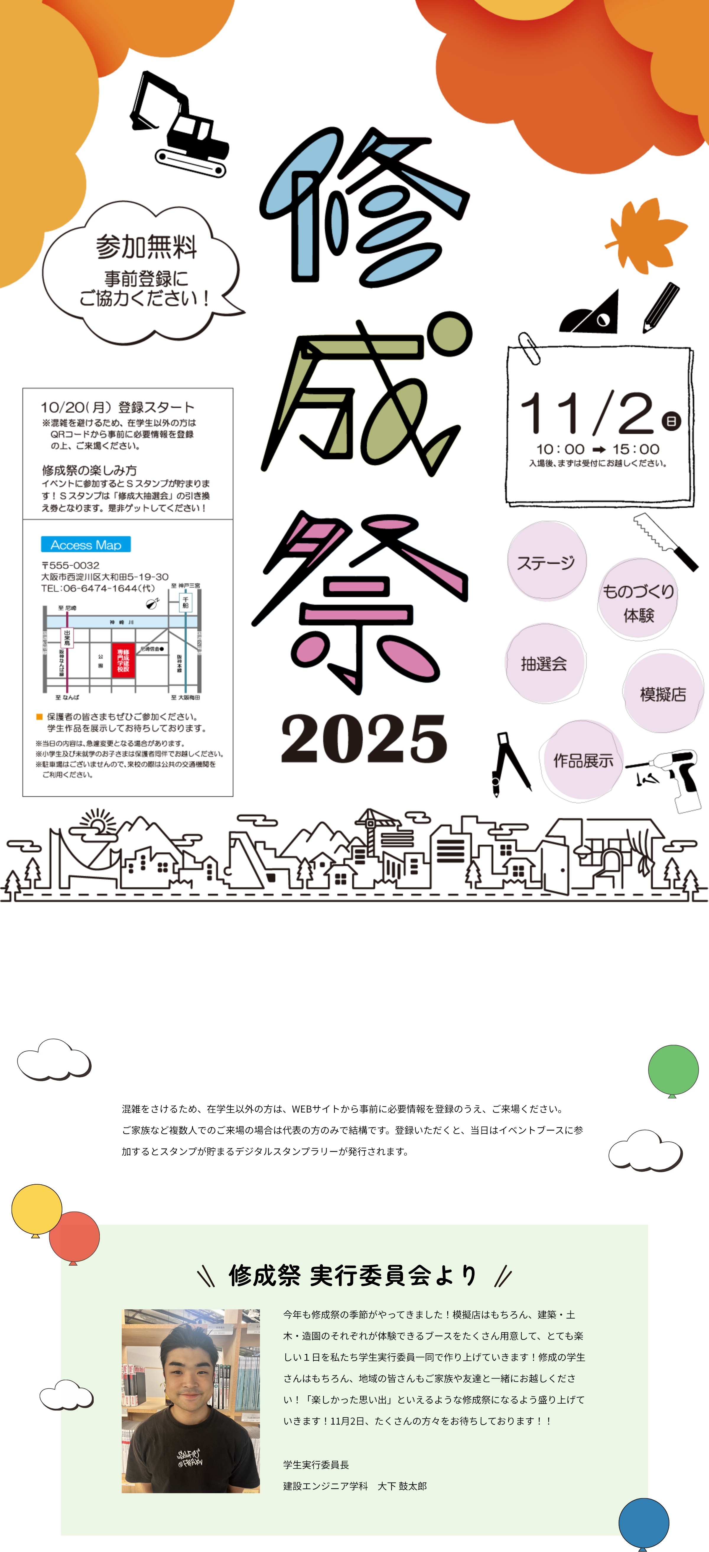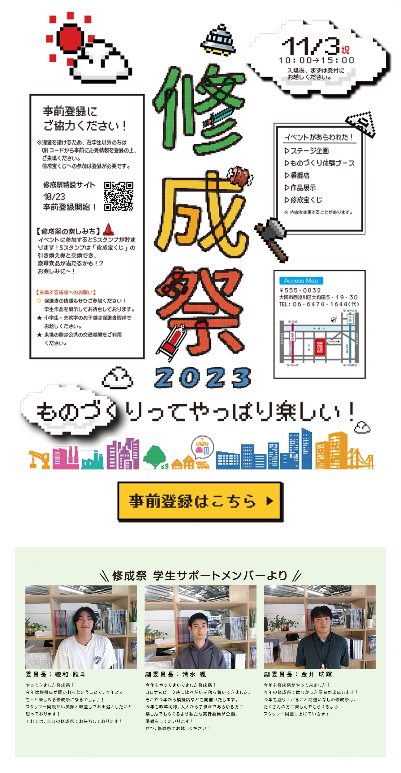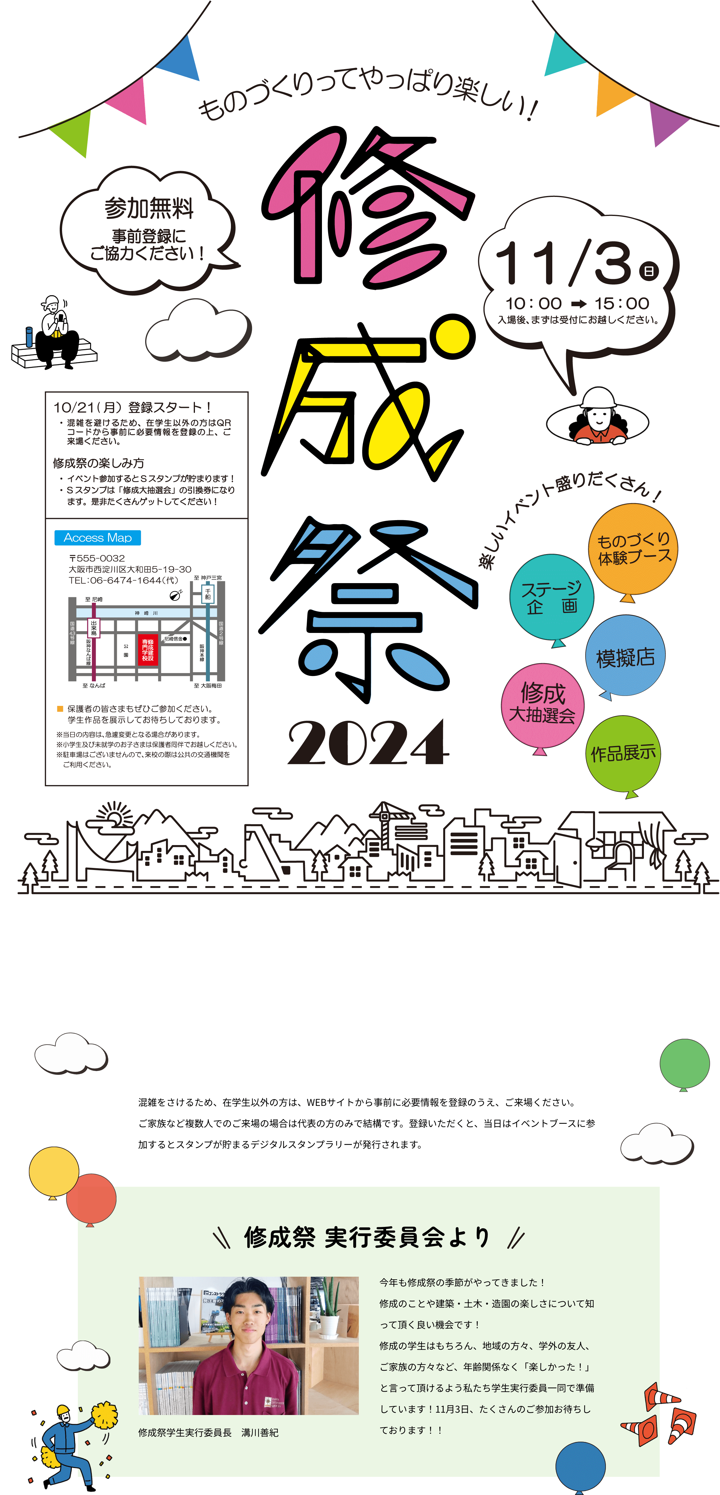 今年も修成祭の季節がやってきました!修成のことや建築・土木・造園の楽しさについて知って頂く良い機会です!修成の学生はもちろん、地域の方々、学外の友人、ご家族の方々など、年齢関係なく「楽しかった!」と言って頂けるよう私たち学生実行委員一同で準備しています!11月2日、たくさんのご参加お待ちしております!!