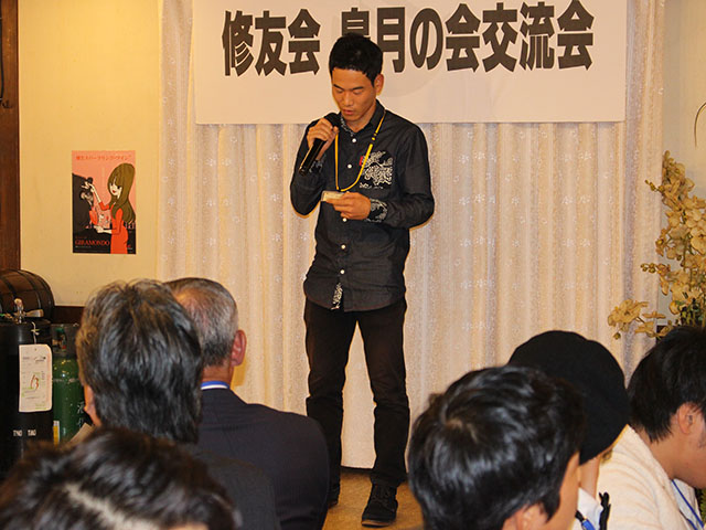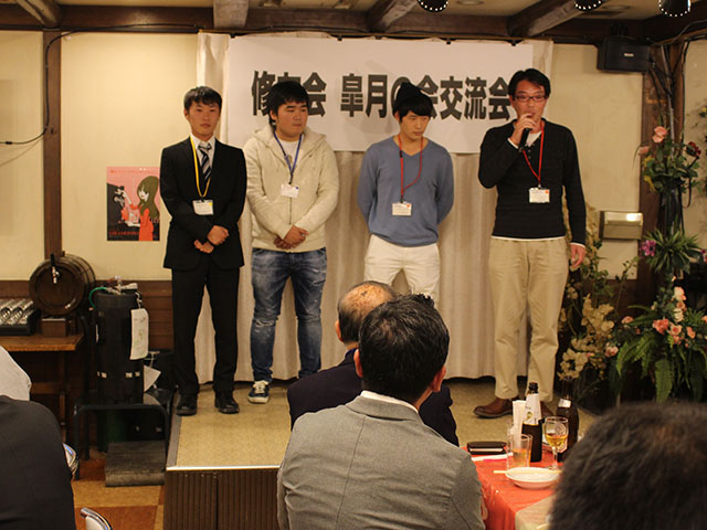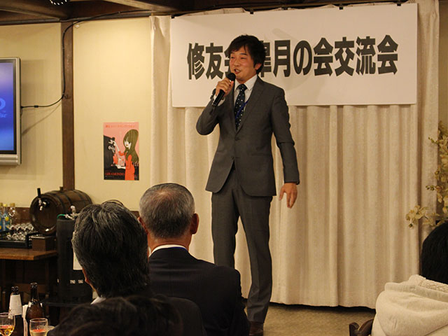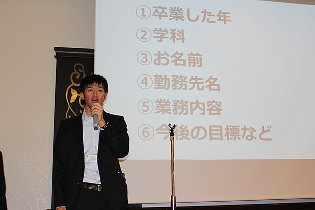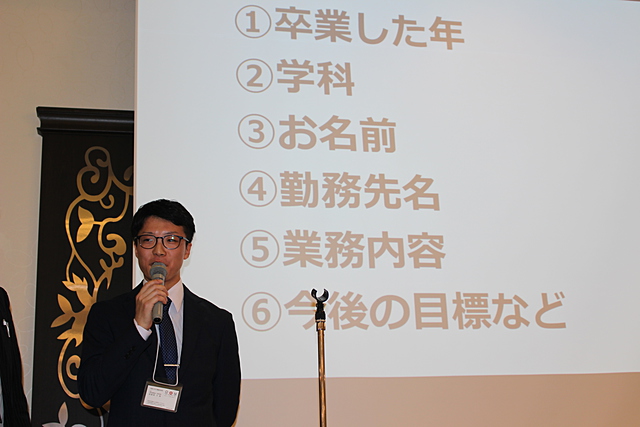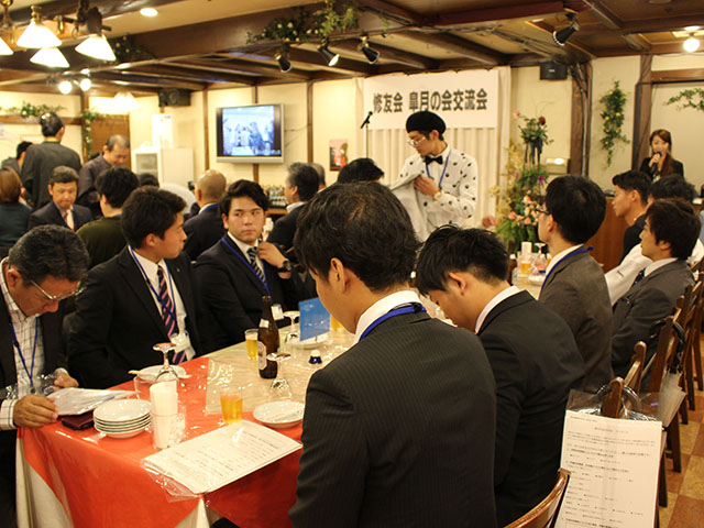 当日は、平成元年に卒業された方から、今年の3月に卒業された新卒の方まで、教職員・修友会役員を合わせまして44名のご参加をいただき、名刺交換タイムや1分間で自社PRをしていただく・・・など歓談とは別にイベントタイムを設けさせていただきました。