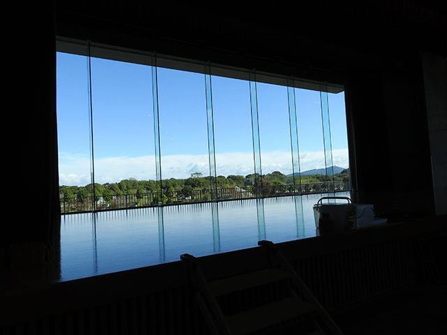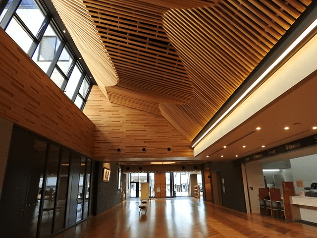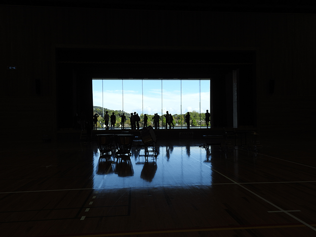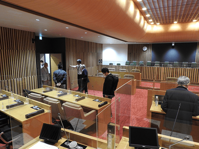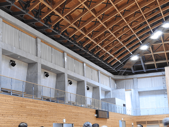 県産材を多用した各施設は木材の良い香りが漂い、体育館は舞台の背面がガラス張りになっており、五條市の素晴らしい山並みを望むことができました。市庁舎においては貴重な免震ピットや議場を見ることができました。