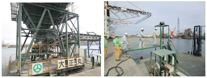 まず、アスファルト混合物の原料の一つである砕石(さいせき)が船で運ばれて来る場所です。