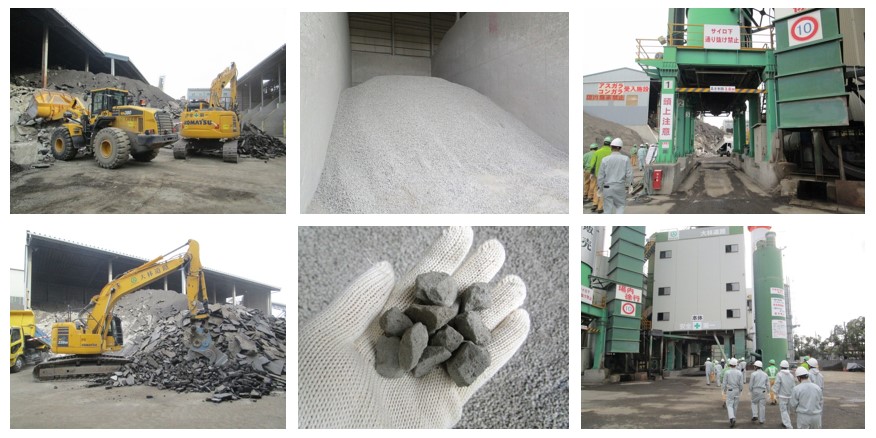また、こちらの工場では工事で撤去されたアスファルトやコンクリートを粉々にし、骨材や再生加熱アスファルト混合物として再利用できるようにしています。