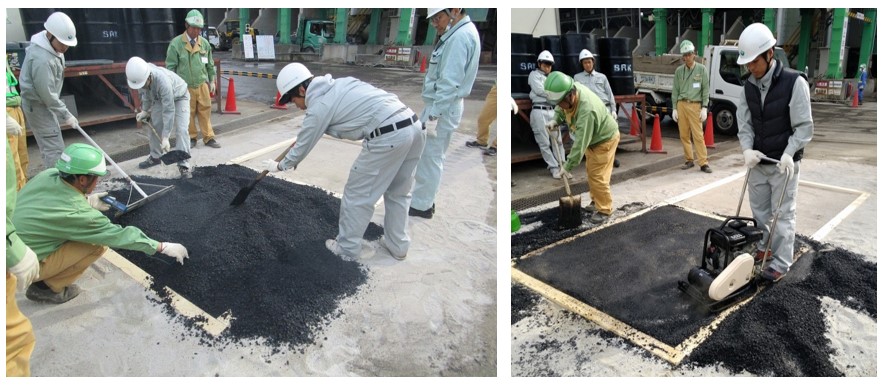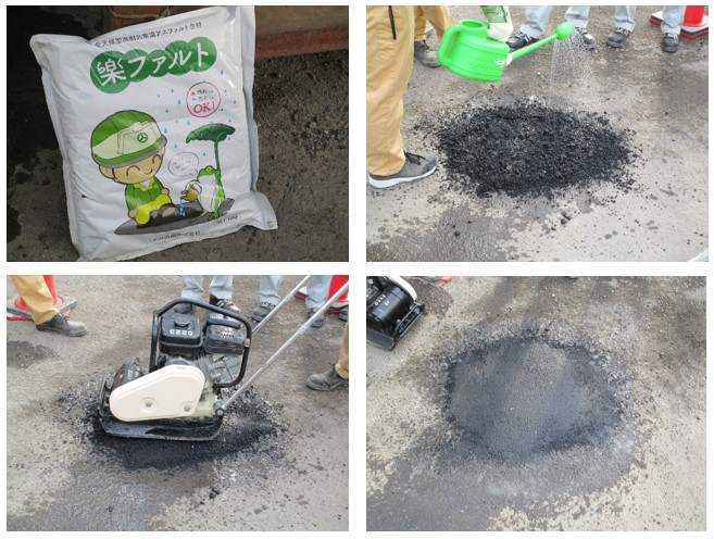 最後に、大林道路株式会社様の製品である『楽ファルト』という常温アスファルト合材の施工を見せていただきました。