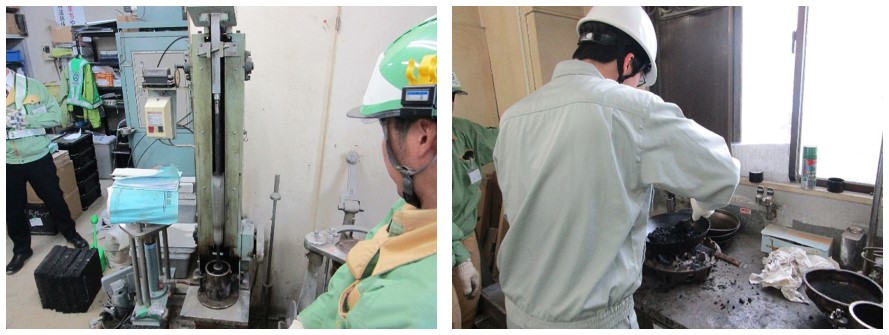 続いてアスファルト混合物の配合設計に用いる「マーシャル安定度試験」の供試体(きょうしたい)の作成手順を教えていただきました。