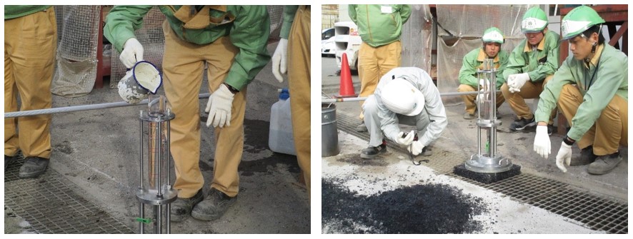 15秒間で1,000ml以上の水が舗装に浸透するかを確認する試験です。