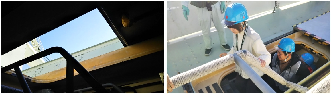 この通路は海面から約40m以上の場所。なんと床のグレーチングの隙間から海面が丸見えです。