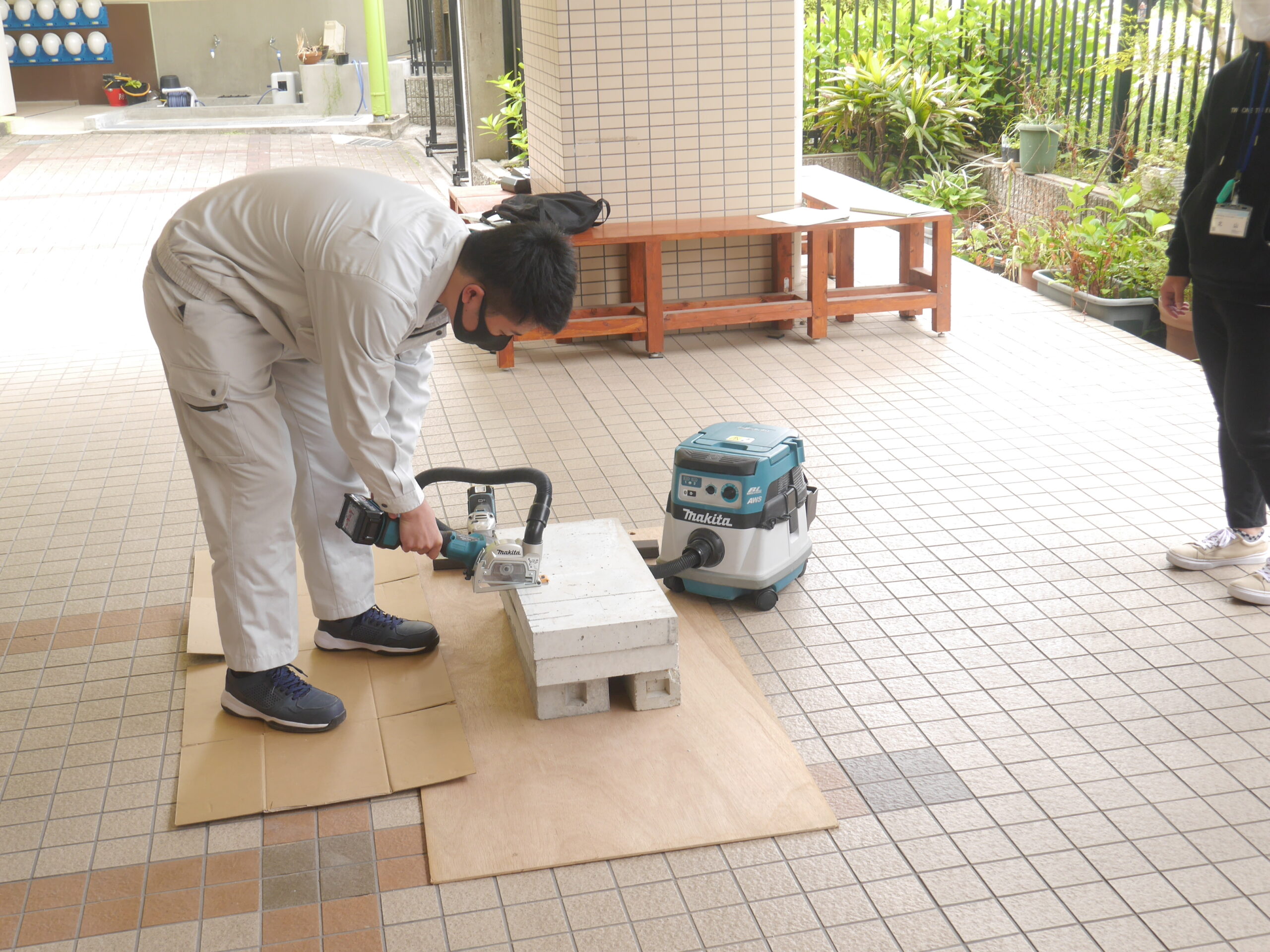 切断工具の使用では、キックバック(材料にはまり込んだり、固いものにぶつかったりして、工具が跳ね返る現象)を起さないための注意点も指導していただきました!!