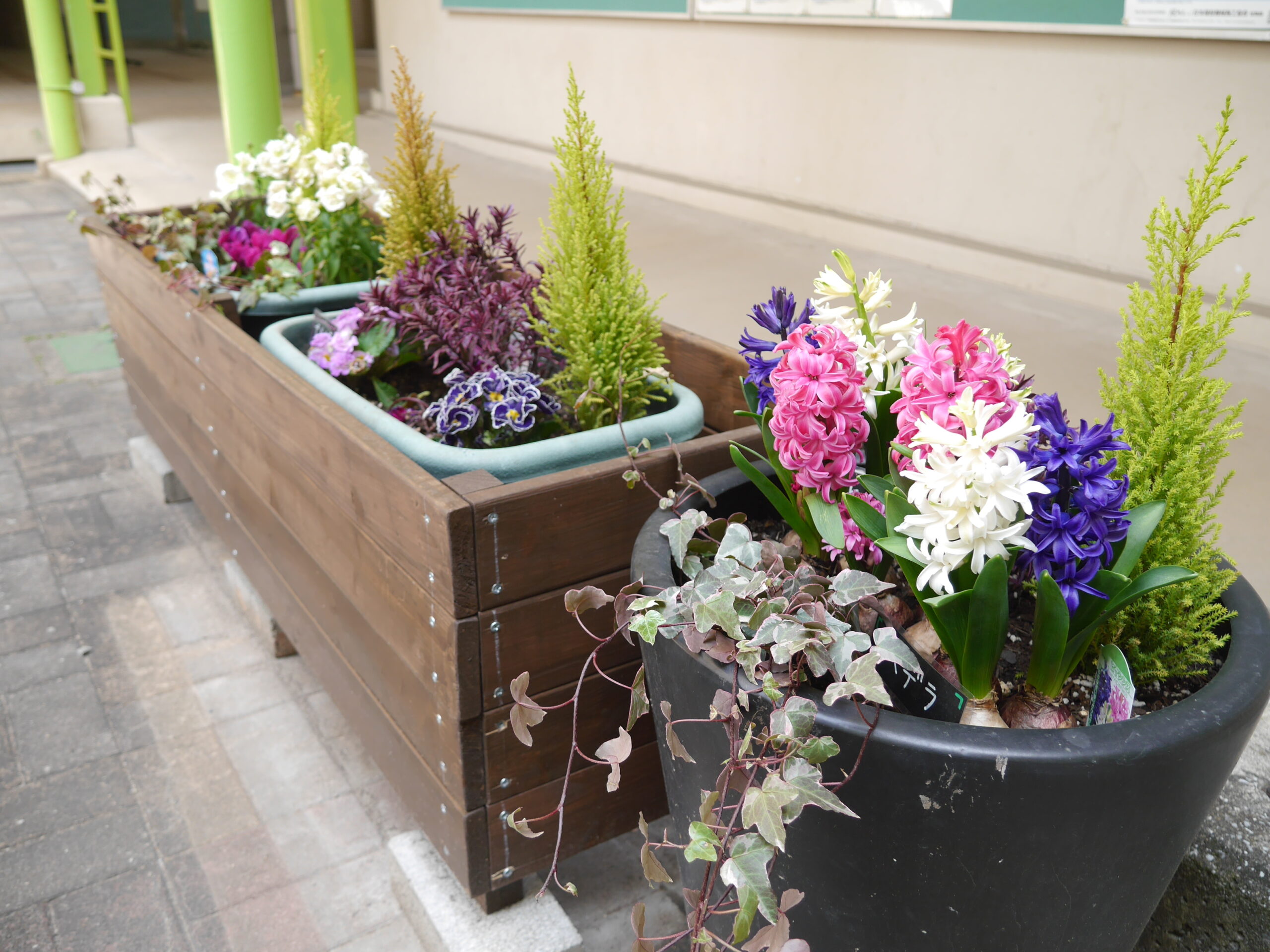 1階にはプランターが並んでいるので、そちらにも草花の寄せ植えをしました🌷🌷