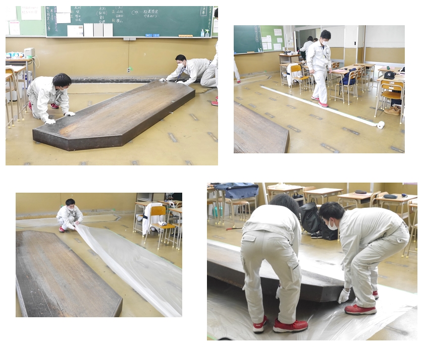 教壇を塗装するために、まずは移動させ、床が汚れないように養生します