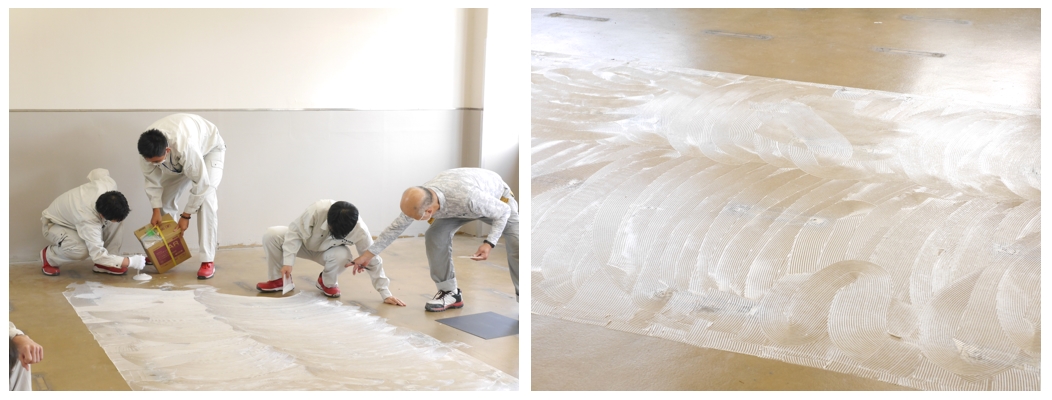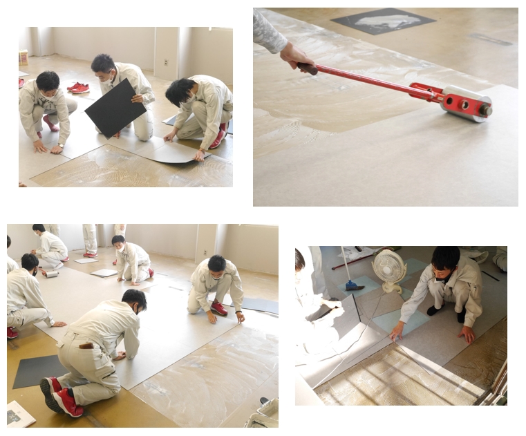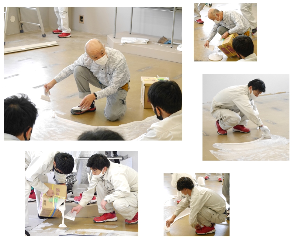 続いて、4色のシートを床に貼り付けるために、専用の接着剤を広げていきます