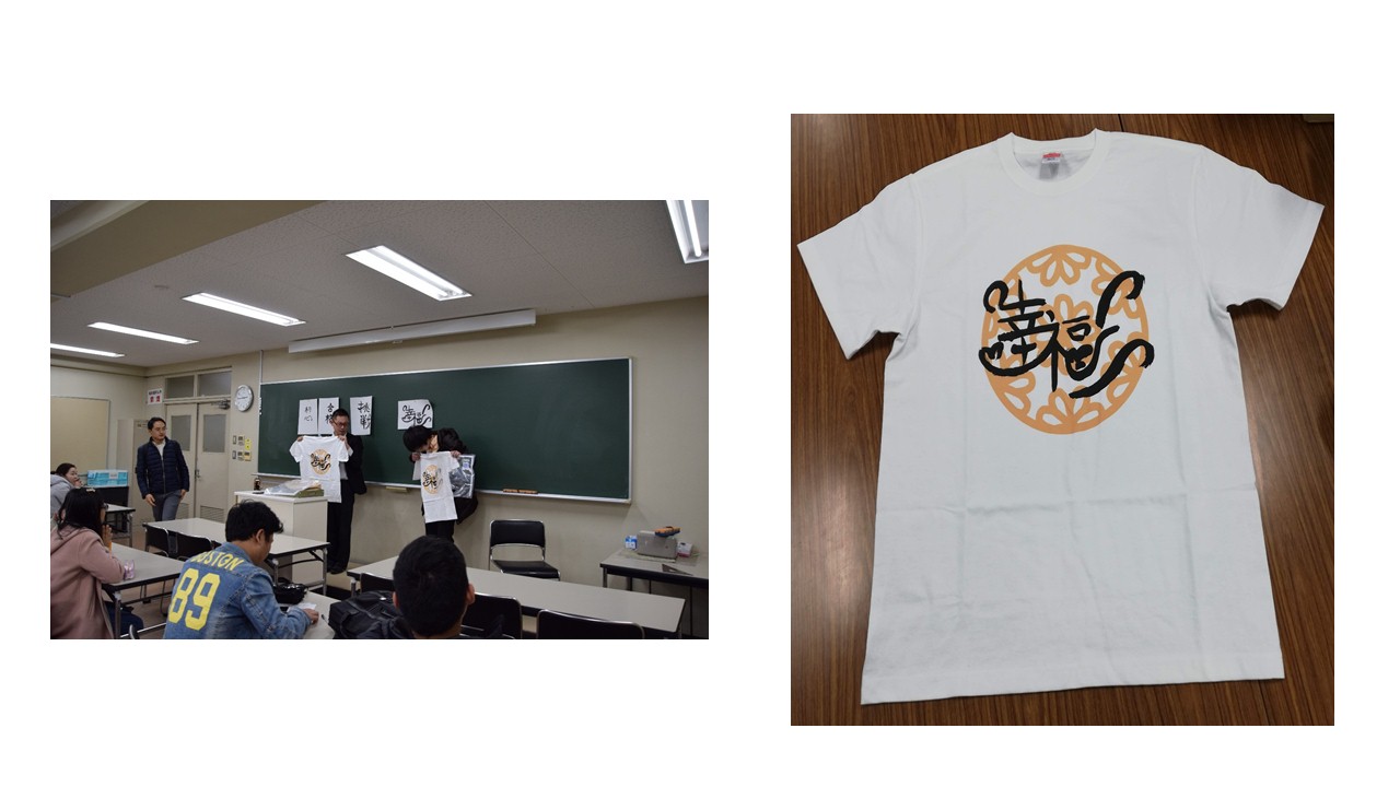 ちなみにこの授業では、学生が書き初めした内容を全員で投票し、 最優秀作品をプリントしたTシャツをご本人にプレゼントしました。
