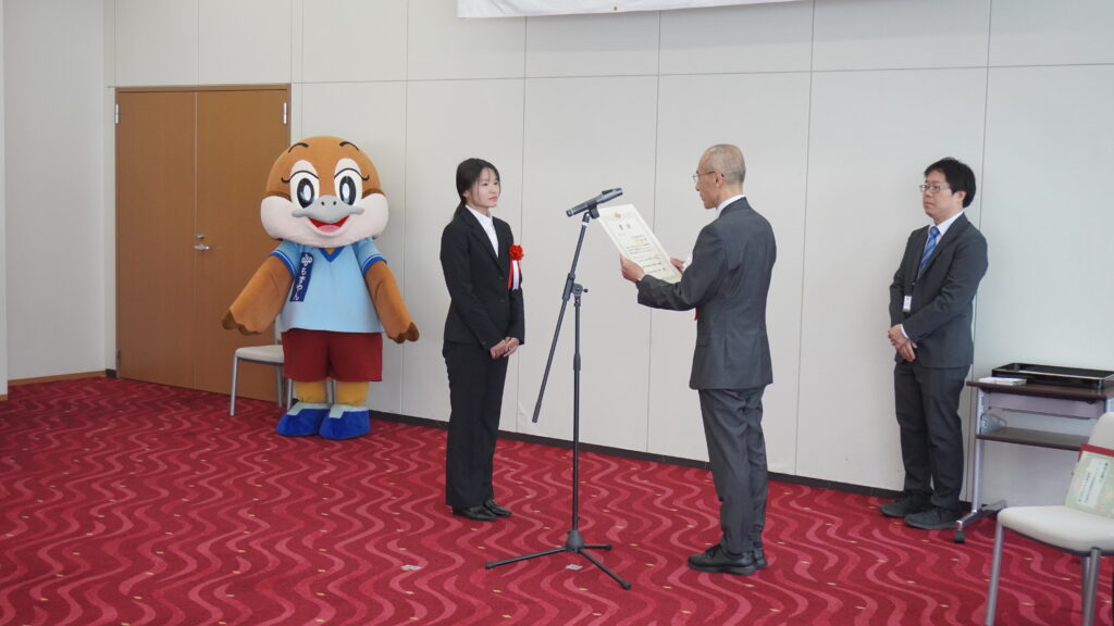 午前の授賞式は、地上50階の迎賓会議室で行われました。 大阪府広報担当副知事の「もずやん」も見守ってくれる中、終始和やかな雰囲気で式は進みました。