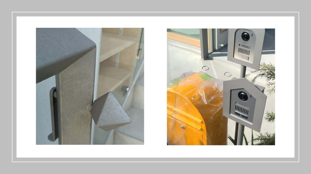 独立型のインターホンは一つ目小僧の見張り番のようで、門扉のハンドルもかわいかったです!
