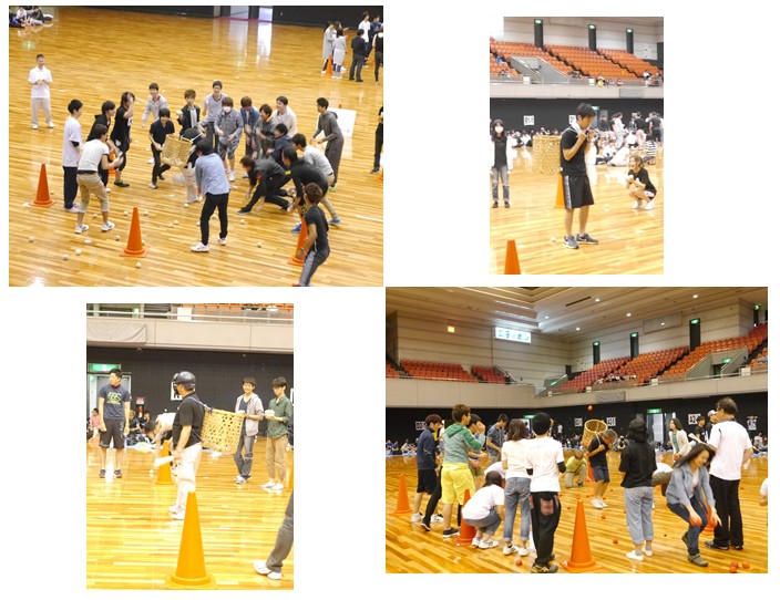 逃げ回る先生が背負ったかごに皆で玉を投げ入れる、玉入れ。