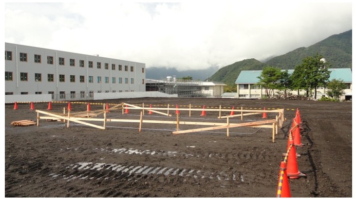 測量で、建物や柱壁などを造る位置を出す「墨出し」、高さを決める「水盛り、遣り方」、「配筋」、「型枠」、「足場」の組立を行い、