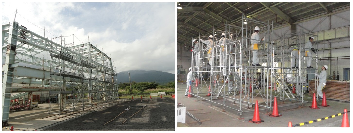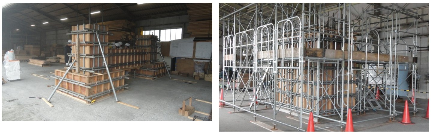 橋の橋脚施工のため足場の組立から鉄筋、型枠の組立までを行いました。
