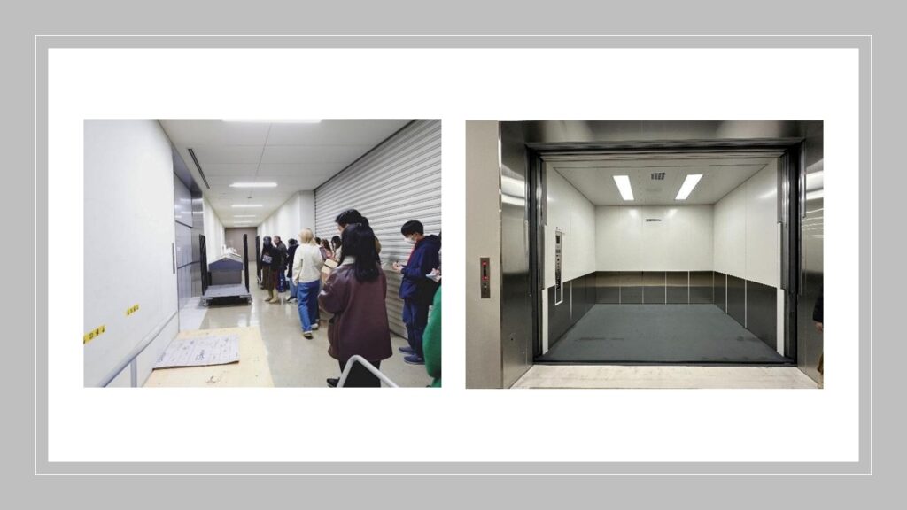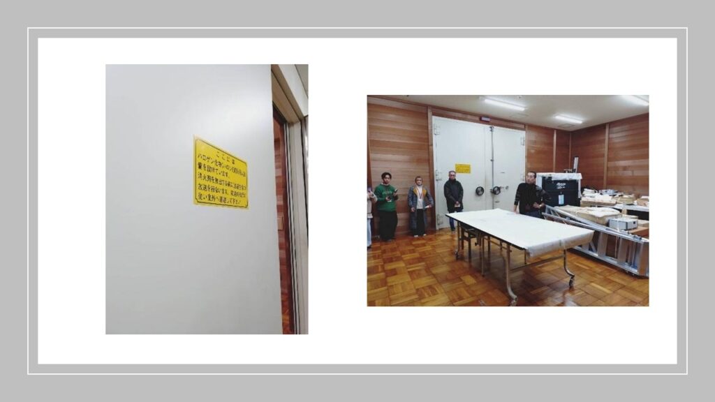 搬入口から、作品用エレベーターを見学し、収蔵庫前を通り、いよいよ収蔵庫へ(; ・`д・´)