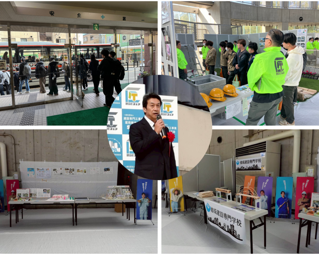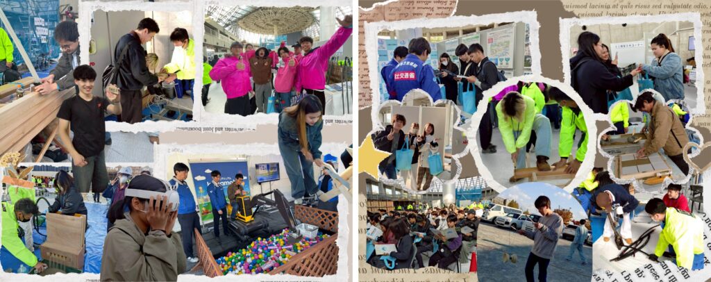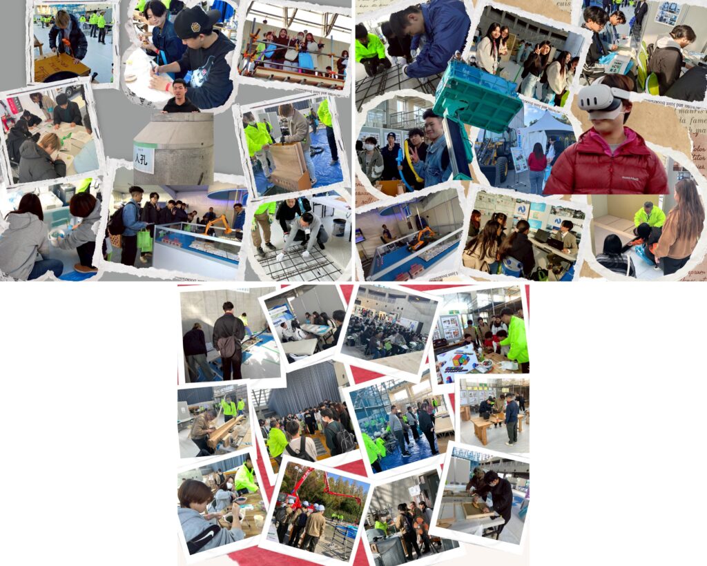 ゼネコン紹介ブースで11社の企業の方々の話を聞いたり、パネル展示ブースでバーチャルVR体験をしたり。技能体験ブースでは、コンクリート打設体験や防水塗装、タイル施工。鉄筋結束、鉋削り、丸太を切ってコースターを作ったり、塗装体験、壁塗り体験、ダクトの通り抜け、電気工事、GLボード貼り、釘打ち体験、キューブ体験など14種のそれぞれの体験ができるブースが設置されていて学生は興味のある工種の体験を行いました(; ・`д・´)