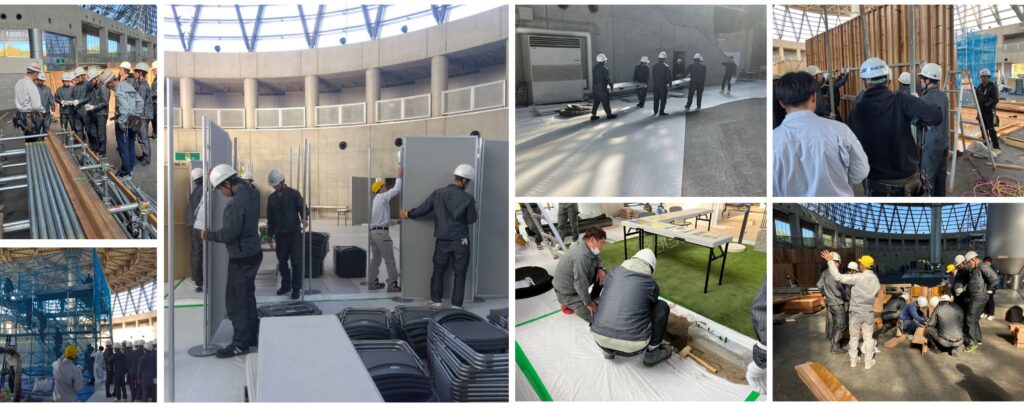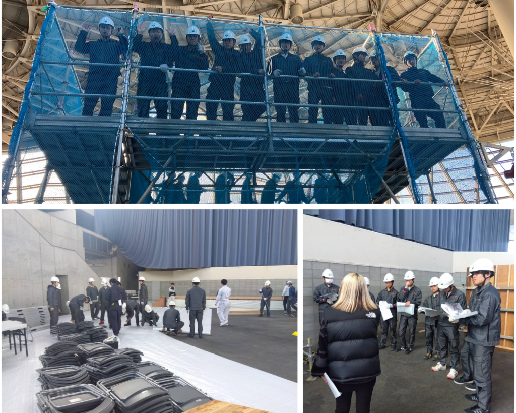 企業の方々の指示に従い、ステージ、地中梁のモックアップ、スラブ支保工のモックアップなど様々な準備を施工学科1年生が実施してくれましたヾ(≧▽≦)ノ